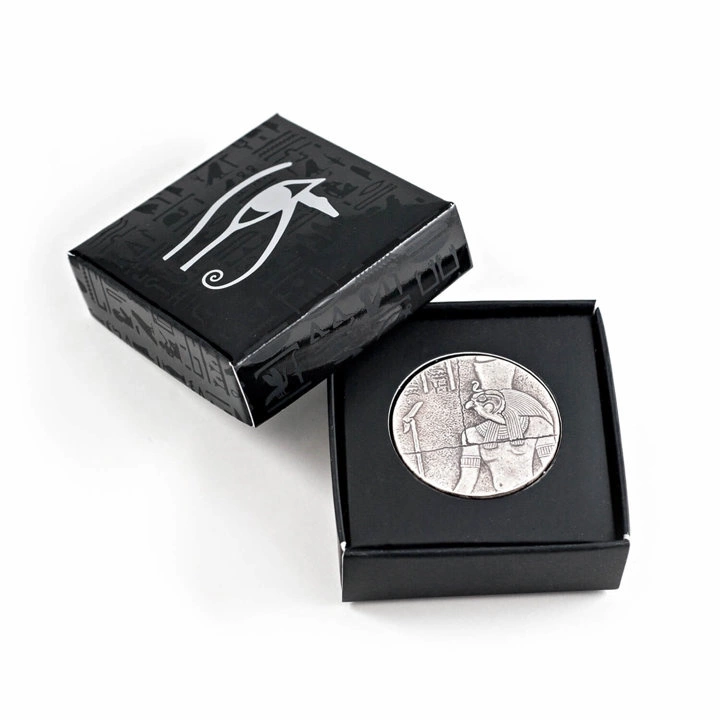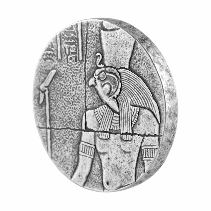 Az érme hátlapján egyiptomi hieroglifák és Horus portréja látható.