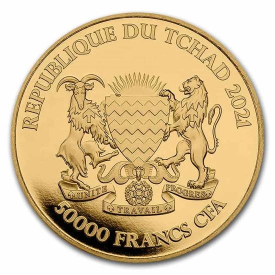Az aranyérme előlapján Csád címere, valamint a kibocsátás éve és az érme névértéke szerepel.