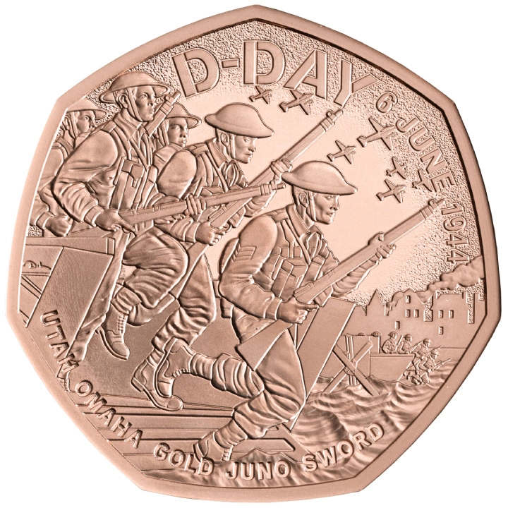 Az érme hátoldalán a neves művész, David Lawrence által tervezett motívum látható, amely a partraszállás során életüket kockáztató szövetséges katonákat ábrázolja, a „6 JUNE 2024”, „D-DAY”, „UTAH OMAHA GOLD JUNO SWORD” feliratokkal.