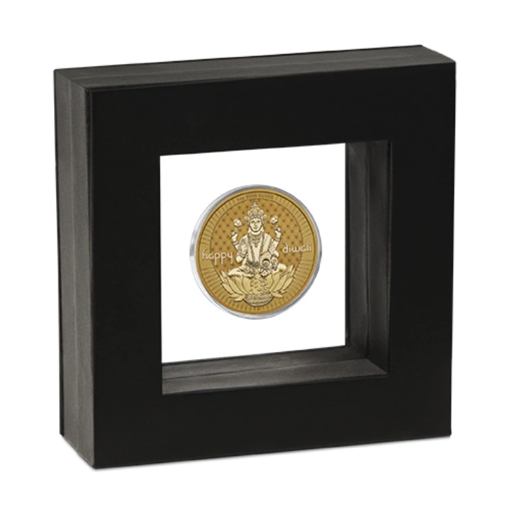 A hátoldalon Lakshmi látható, aki egy lótuszvirágon ül. Az istenséget virágmotívumok és sugárzó vonalak veszik körül. A hátoldalon a „HAPPY DIWALI” felirat és a fém súlyára és tisztaságára vonatkozó információk is szerepelnek.