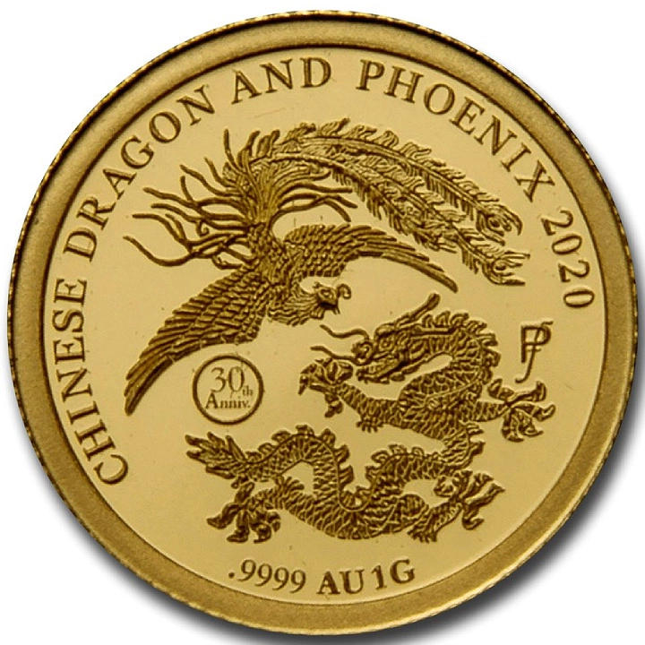 A hátlapon egy sárkány és egy főnix képe, valamint a kibocsátó ország, a verés éve és a fém tisztasága látható.
