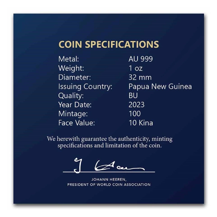Jego emisja jest ograniczona do 100 sztuk, a każda moneta posiada gwarancję rządu Papui Nowej Gwinei oraz jest pełnoprawnym środkiem płatniczym na terenie kraju emitenta.