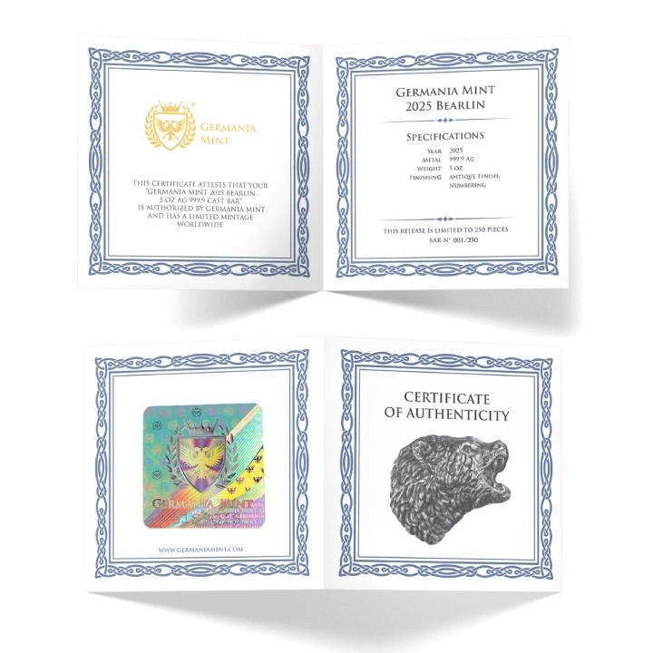 Germania Mint rúd: Bearlin 5 uncia ezüst 2025 antik kivitel