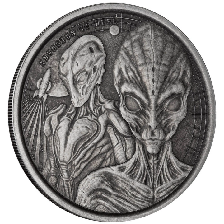 Az érme hátlapján két idegen képe és az „INVASION IS HERE” (A megszállás megérkezett) felirat látható.