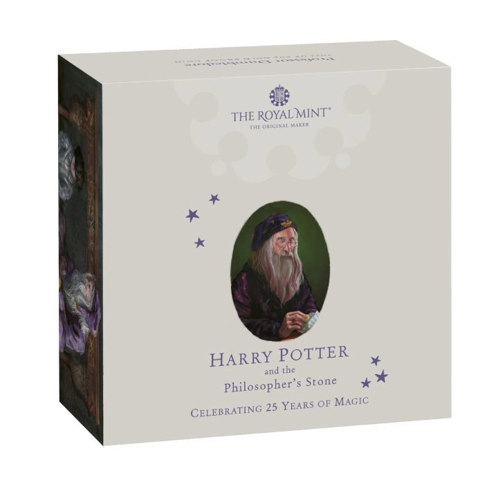 A Harry Potter: Albus Dumbledore 50p Gold 2023 Proof egy egyedülálló érme, amely a Harry Potter és a bölcsek köve első kiadásának emlékére készült, amely 1997. június 26-án jelent meg az Egyesült Királyságban. 2022-ben a könyv ünnepelte 25. évfordulóját. Ez a hét kötetes regénysorozat első része, amelynek főszereplője Harry Potter, aki szembeszáll a varázslók világában találkozott gonoszsággal. Ez a „Harry Potter 25. évfordulója” sorozat harmadik érméje.