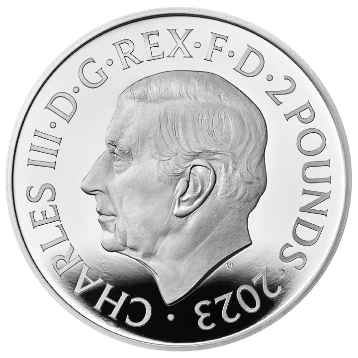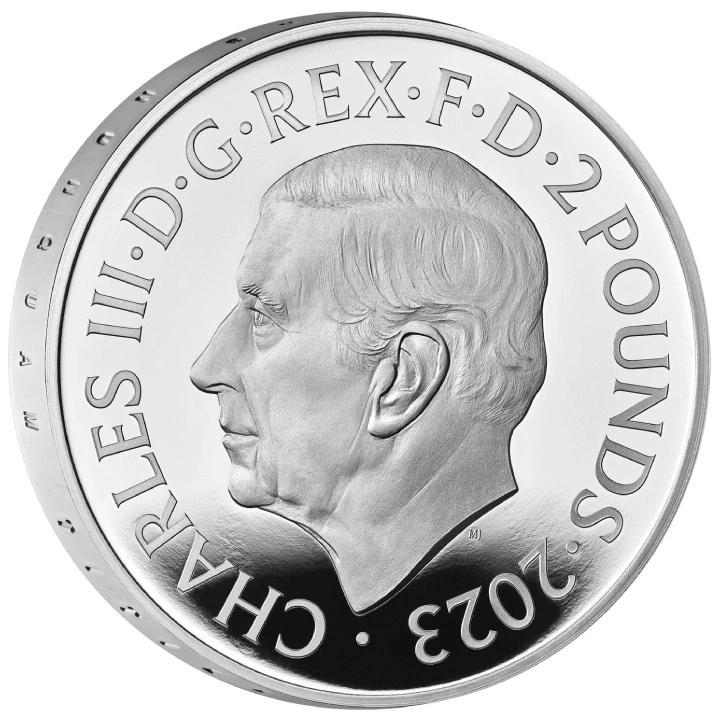 Az érme előlapján III. Károly brit király arcképe, a névérték és az évszám látható, a tervező Martin Jennings.