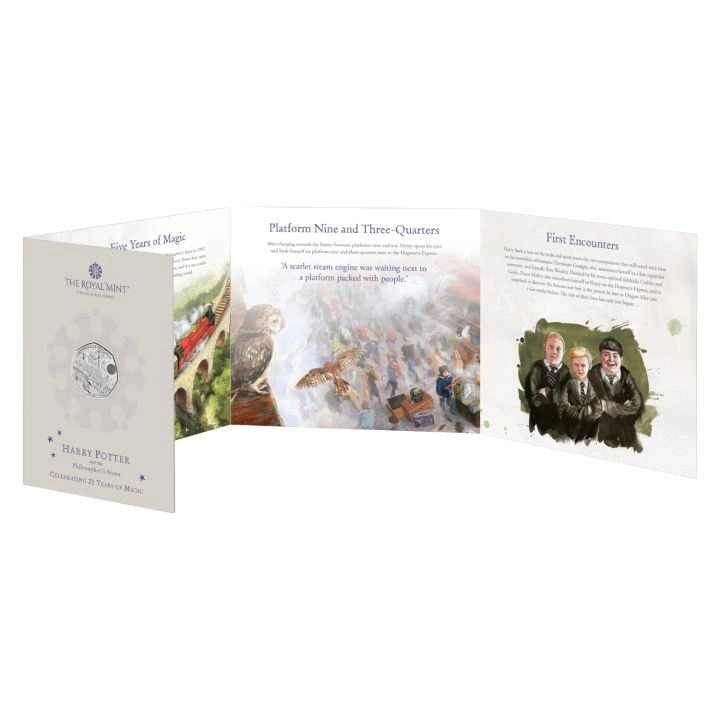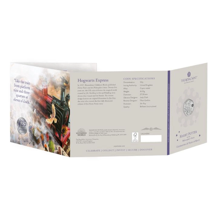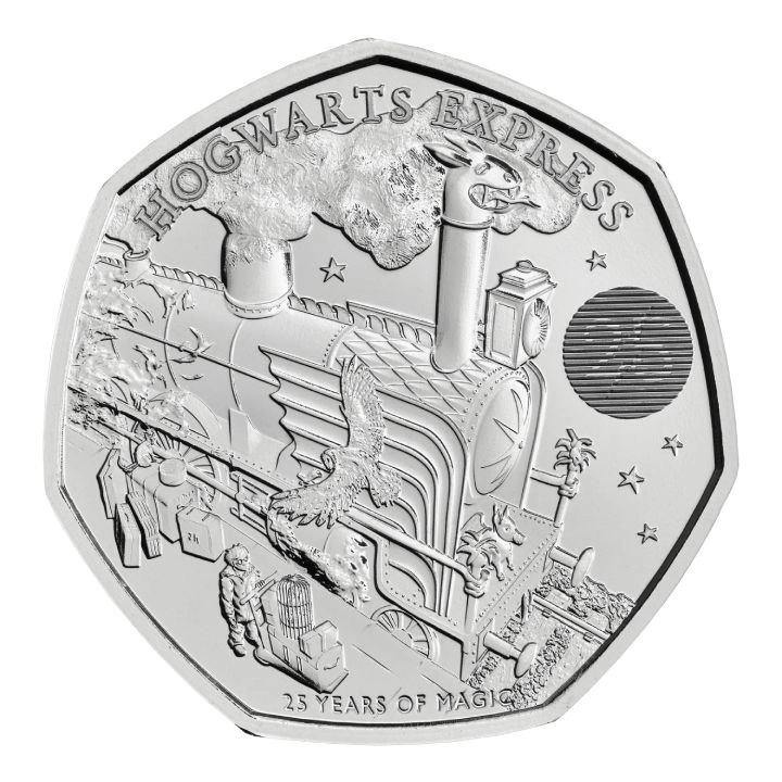 Az érme hátoldalán egy vonat és a „HOGWARTS EXPRESS” és „25 YEARS OF MAGIC” feliratok láthatók. A hátoldalt Ffion Gwillim tervezte.