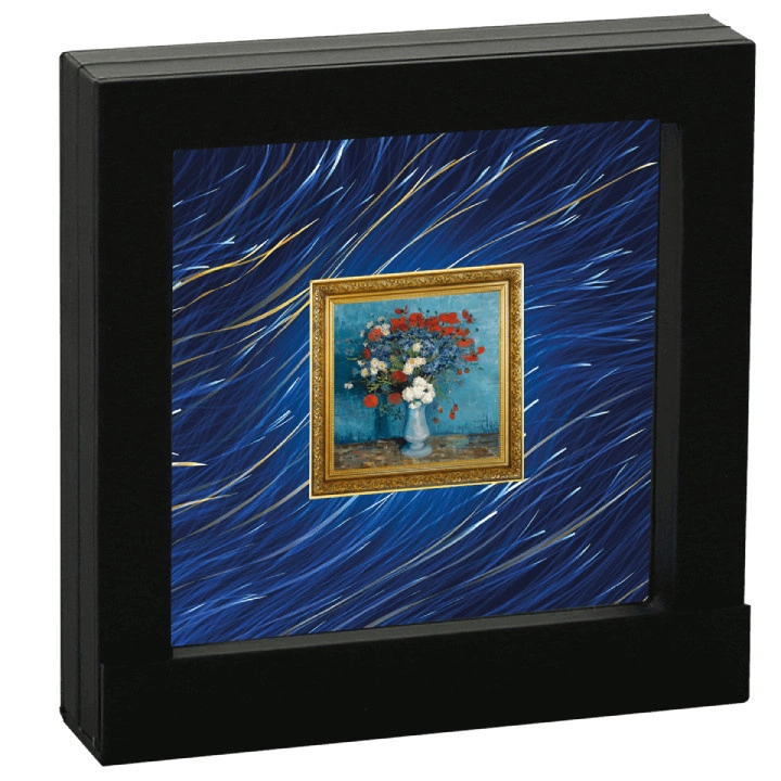 A hátoldalon Vincent van Gogh Vázával, búzavirágokkal és pipacsokkal című festményének színes reprodukciója látható.