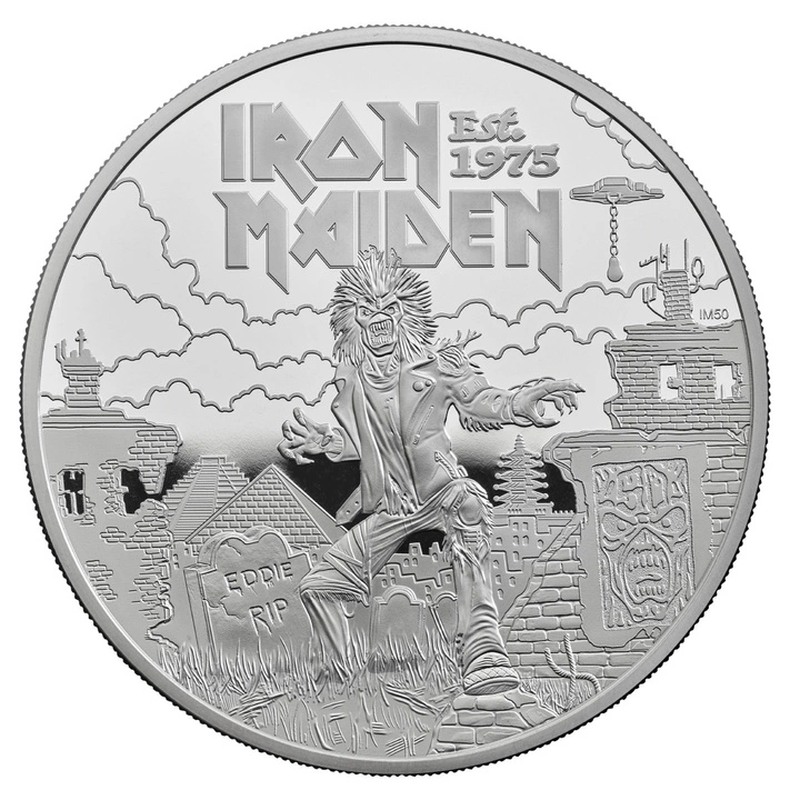 Az Iron Maiden 5 unciás ezüst 2025 Proof gyűjtői érme egyedülálló tisztelgés a zene történetének egyik legikonikusabb zenekarának, az Iron Maidennek az 50. évfordulója előtt. Ez az Ag.999 ezüstből limitált kiadásban vert érme egyedülálló lehetőség a heavy metal rajongók, gyűjtők és nemesfém befektetők számára. Ez az első hivatalos érméje az Egyesült Királyságnak, amelyen az Iron Maiden, a rock és a metal történelmét meghatározó legendás zenekar szerepel. A hátoldal tervezője Alberto „Akirant” Quirantes, a zenekarral kapcsolatos számos klasszikus illusztráció alkotója. Az érme többek között a zenekar ikonikus kabaláját, Eddit ábrázolja. Az érme modern, szemet gyönyörködtető csomagolásban kerül forgalomba, amely a zenekar történetét mutatja be 1975-ös debütálásától napjainkig. Ezenkívül mind az érme tervezése, mind a grafikai elrendezés rejtett szimbólumokat és utalásokat tartalmaz a zenekar legfontosabb albumaira és turnéira. Előlap A brit uralkodó képe látható rajta, királyi feliratokkal, a címlettel és a kibocsátás évével. Az előlap klasszikus és elegáns kialakítása megfelel a tekintélyes gyűjtői kiadások szabványainak. Hátlap Alberto „Akirant” Quirantes lenyűgöző illusztrációja, amely Eddie-t, az Iron Maiden ikonikus kabaláját ábrázolja. A dizájnt a zenekar neve, „IRON MAIDEN”, és az „EST. 1975” felirat gazdagítja. A háttérben rejtett részletek utalnak a zenekar történetére, amelyeket csak a leghűségesebb rajongók fedezhetnek fel.Tervező