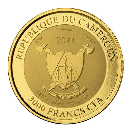 Kamerun: Mandrill 1 oz Gold 2021 Proof egy tiszta Au.9999 fémből vert aranyérme, amelynek súlya egy troy uncia, átmérője 32 mm, proof minőségű. A mindössze 100 darabos limitált kiadású érmét a neves amerikai Scottsdale Mint pénzverde gyártja. Minden érme egyedi, eredeti csomagolásban, sorszámozott eredetiségigazolással kerül forgalomba.