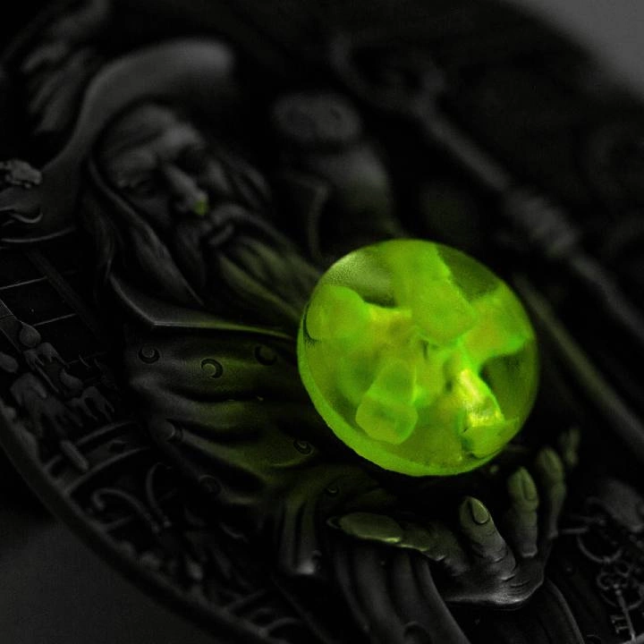 Az érme hátoldalán egy varázsló látható, aki egy színes gömböt tart a kezében.