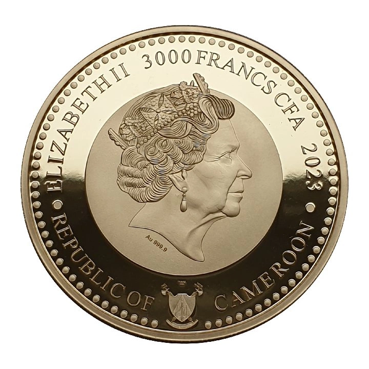 Az aranyérme előlapján II. Erzsébet királynő képe és a Kameruni Köztársaság címere látható, valamint az érme kibocsátásának éve és névértéke.