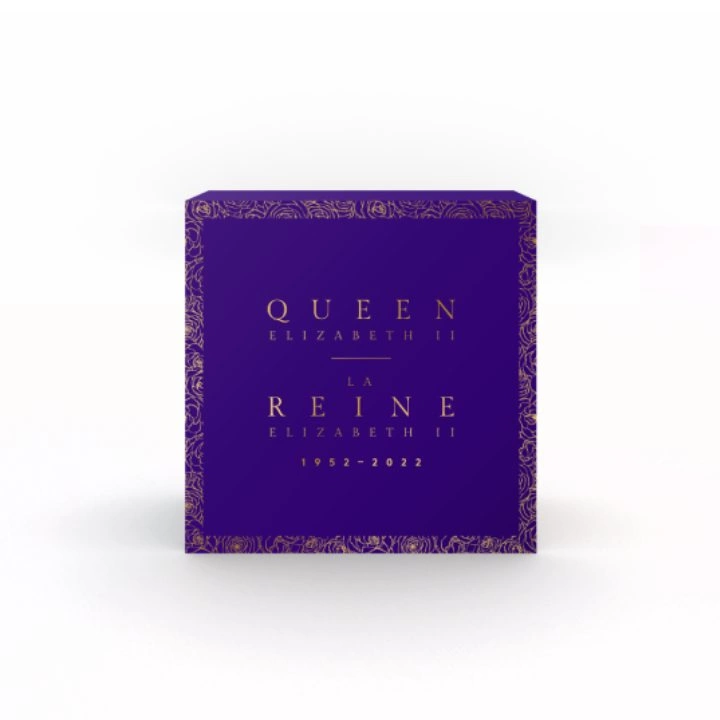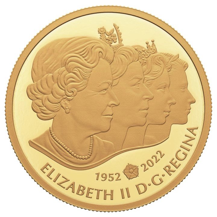 Az előlapon II. Erzsébet királynő négy profilképe látható, valamint az „ELIZABETH II D G REGINA” és „1952-2022” feliratok.
