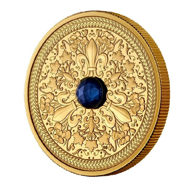 A hátlapon egy kék zafír és francia szimbólumok láthatók.