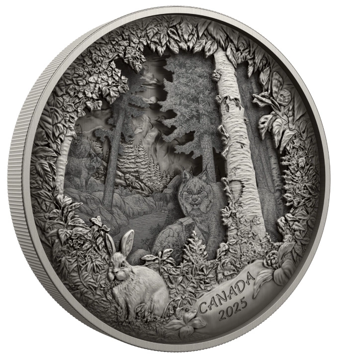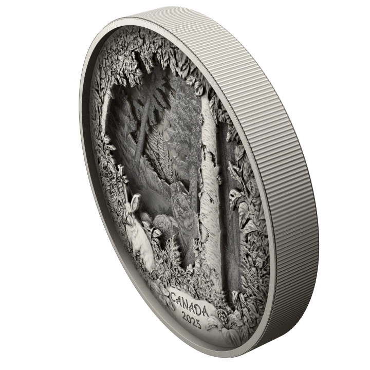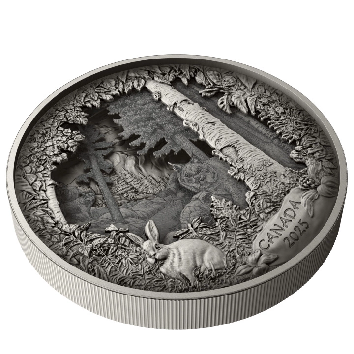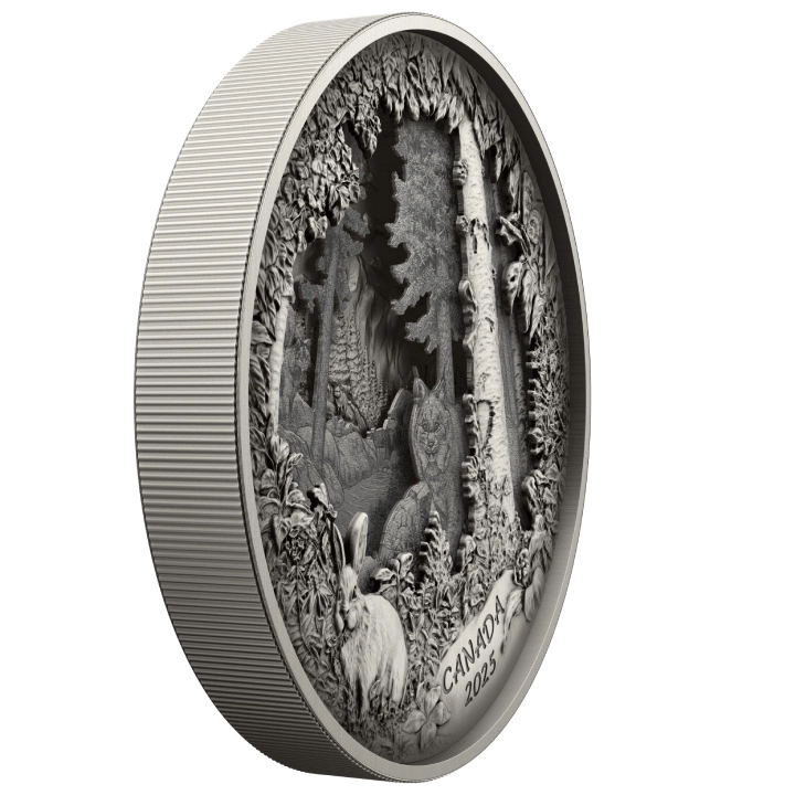 Az érme hátoldalán egy dinamikus, többrétegű jelenet látható, buja növényzettel és rejtett állatokkal, amely a ragadozók és zsákmányaik közötti komplex kapcsolatot szimbolizálja. Neil Hamelin által tervezett motívum lenyűgöző részletességgel mesél el egy izgalmas történetet numizmatikai művészet formájában.