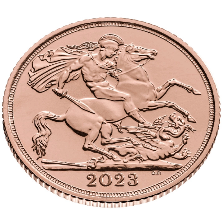 Rewers przedstawia scenę zabicia smoka przez świętego Jerzego. Na dole złotej monety podana jest również data emisji. Projektantem rewersu był Benedetto Pistrucci.