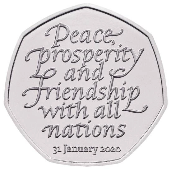 Az érme hátlapján a „Béke, jólét és barátság minden nemzettel” felirat és a 2020. január 31-i dátum látható.