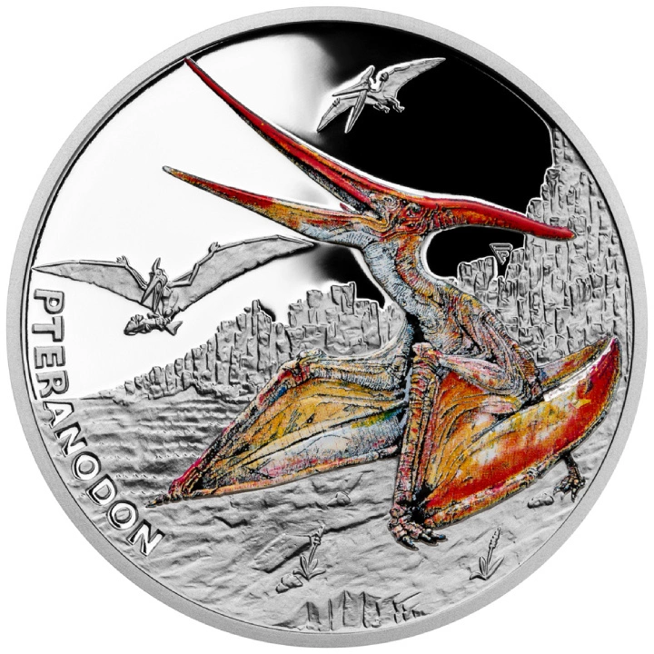 A hátoldalon színes pteranodon látható más dinoszauruszok mellett. A „PTERANODON” felirat a hátoldalon található.