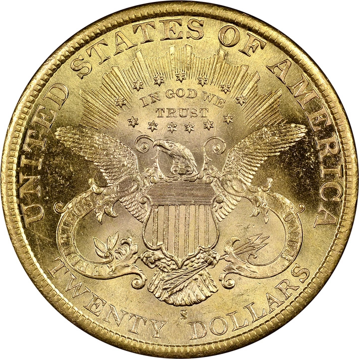 A hátoldalon egy címeres sas látható, mellkasán pajzzsal. Fölötte, 13 csillaggal körülvéve, a „IN GOD WE TRUST” (Istenben bízunk) felirat olvasható. Az érme teljes kerületén az „UNITED STATES OF AMERICA” (Amerikai Egyesült Államok) felirat és az érme névértéke, „TWENTY DOLLARS” (húsz dollár) látható.