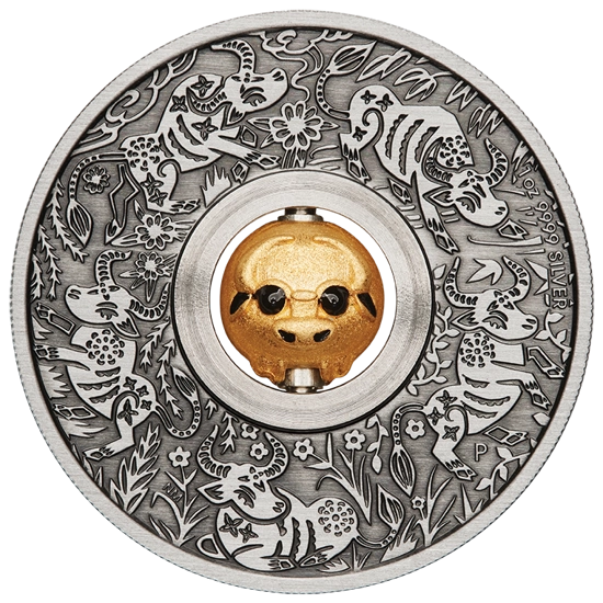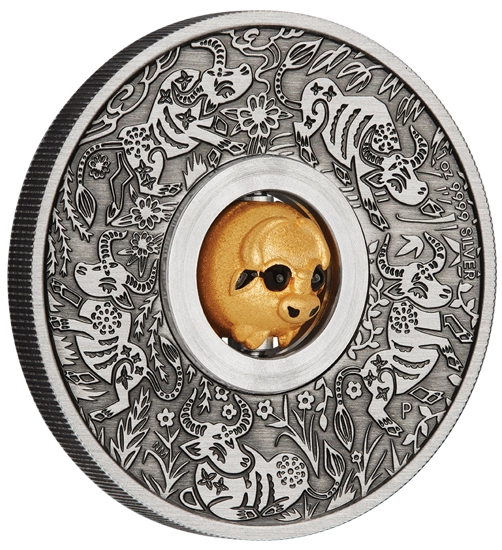 Lunar III: A bika éve 1 uncia ezüst 2021 Forgó medál antikolt felülettel