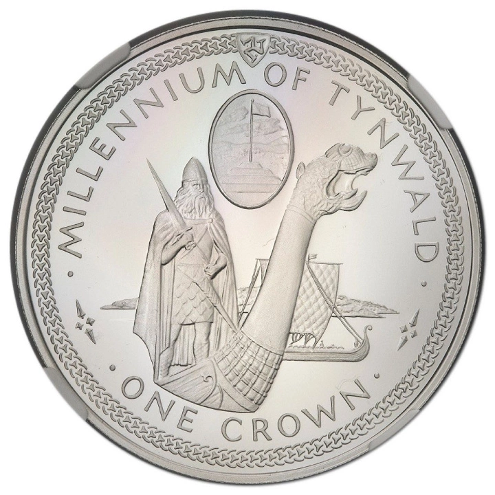 A hátoldalon a Man-sziget kulturális örökségére utaló illusztrációk láthatók. A hátoldalon szerepel a címlet és a „MILLENNIUM OF TYNWALD” felirat is.
