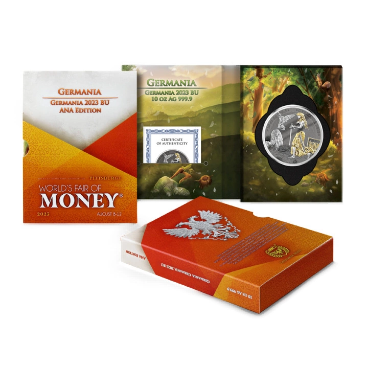 A hátoldalon a Germania pajzsával és kardjával, valamint egy kétfejű repülő sassal díszített ezüstérme látható. Az előlapon a „GERMANIA” felirat és a fém súlyára, tisztaságára és a verés évére vonatkozó információk szerepelnek.