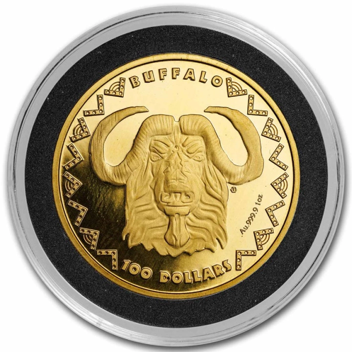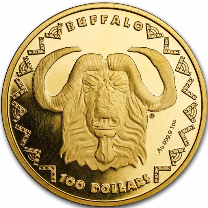 A hátlapon egy afrikai bivaly látható, amelynek stilizált feje afrikai maszkra emlékeztet. Ezenkívül a hátlapon szerepelnek a súlyra, a tisztaság és a névérték, valamint a „BUFFALO” felirat.