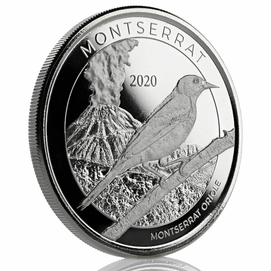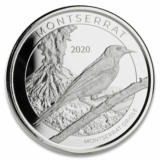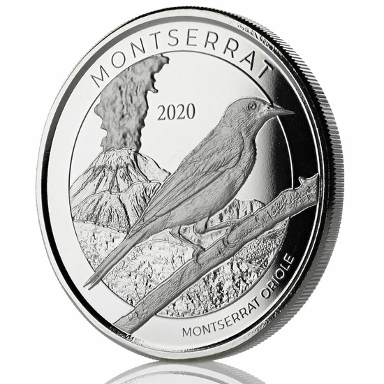 A hátoldalon egy madár, egy okkerszínű sárgarigó látható egy ágon. A háttérben egy kitörő vulkán látható. A hátoldalon a „MONTSERRAT 2020” és a „MONTSERRAT ORIOLE” feliratok is szerepelnek.