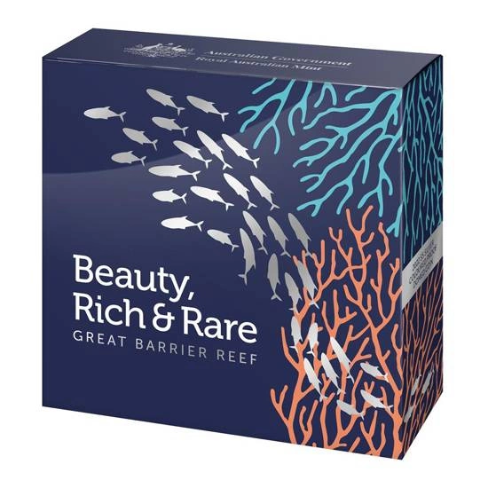 A hátoldalon színes halraj és a korallzátony jellegzetes elemei láthatók, valamint a „GREAT BARRIER REEF” és a „2022 BEAUTY, RICH & RARE” feliratok.