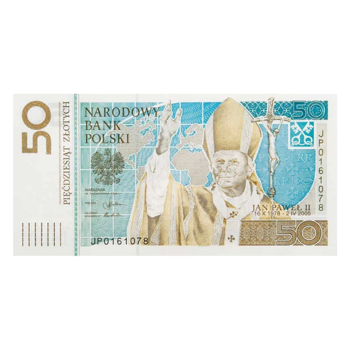 - Optikailag változó tinta – a szám „50” színe megváltozik. UV fényben látható fluoreszkáló elemek. Tapintható jelölések – hét dombornyomott függőleges vonal a vakok számára. Az „50 zł – II. János Pál” egyedi termék a numizmatikai piacon – ötvözi a történelmi és szellemi értéket a fejlett nyomdai technológiával. Nemcsak gyűjtői tárgy, hanem a lengyel pápa emlékének és örökségének szimbóluma is.