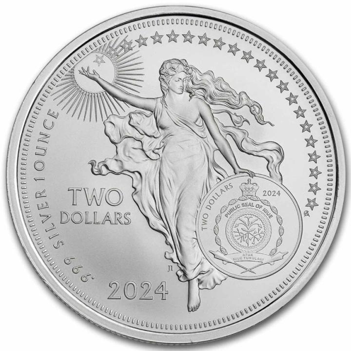 Az előlapon a szabadság istennőjének képe, Niue címere, valamint az érme súlyára, a fém tisztaságára, a kibocsátás évére és a névértékre vonatkozó információk láthatók.