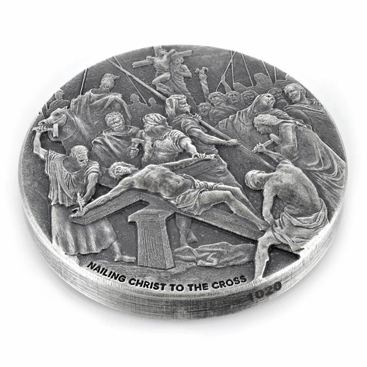 A hátoldalon Jézus kezeinek és lábainak keresztre feszítésének jelenete látható.