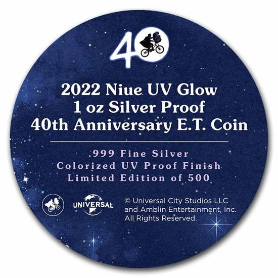 A hátoldalon az ezüstérme színes képe látható, amelyen E.T. jobb kezét felemeli, és bal ujjaival a szívére mutat. A hátoldalon a film 40. évfordulójának logója és az „UNIVERSAL CITY STUDIOS LLC” felirat is látható. A hátoldalon a fém súlyára és tisztaságára vonatkozó információk is szerepelnek.
