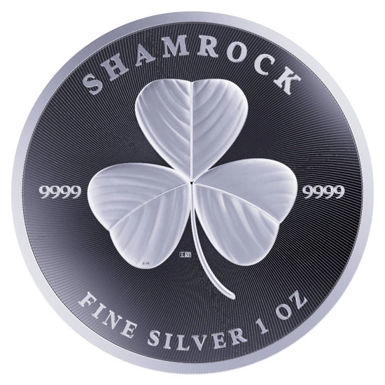Az érme hátoldalán egy háromlevelű lóhere, a „SHAMROCK” felirat és a fém súlyára és tisztaságára vonatkozó információk láthatók.