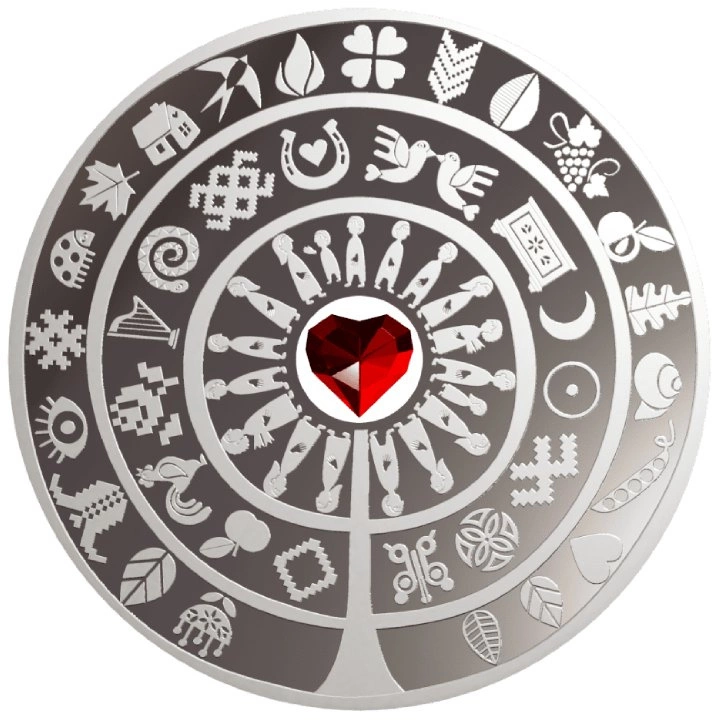 Az érme hátoldalán, mindkét oldalon látható, egy piros Swarovski® kristály szív alakban és a balti kultúra szimbólumai.
