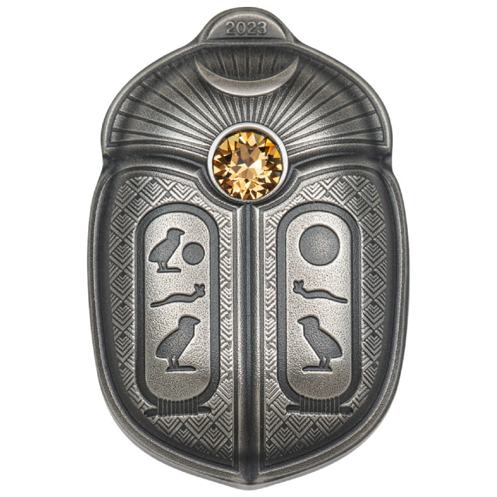 A hátoldalon egy szkarabeusz, a fáraó családneve hieroglifákkal írva és a kibocsátás dátuma látható. Az előlapon egy fényes sárga kristály található.