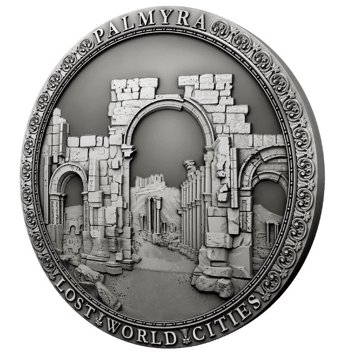 A hátoldalon az ősi Palmyra városának képe látható, valamint a „PALMYRA” és „LOST WORLD CITIES” feliratok.