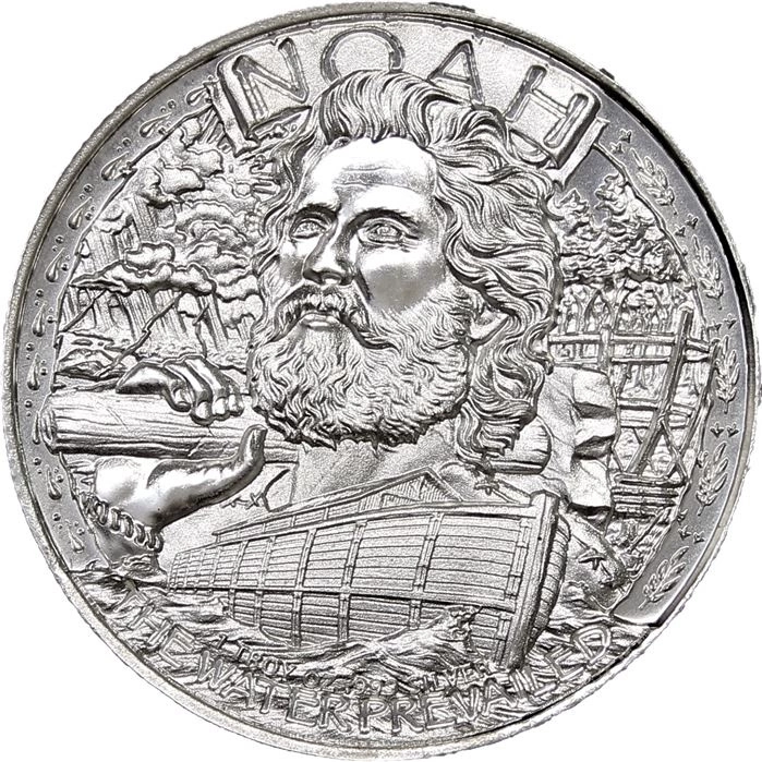 A hátoldalon a bárka és a kalapácsot tartó Noé közelképe látható. A hátoldalon a „NOAH” és „THE WATER PREVAILED” feliratok, valamint a fém súlyára és tisztaságára vonatkozó információk is szerepelnek.
