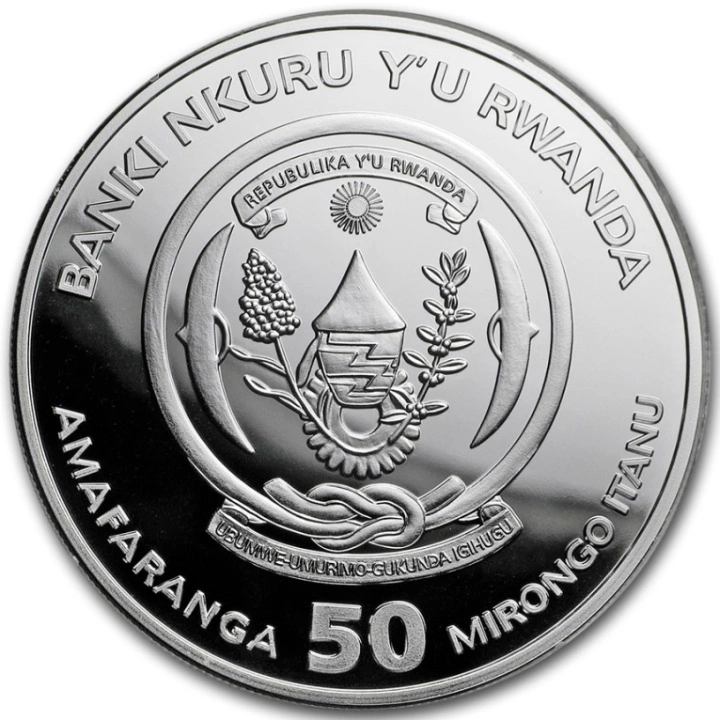 Az ezüstérme előlapján Ruanda emblémája és a névértékre vonatkozó információk láthatók.