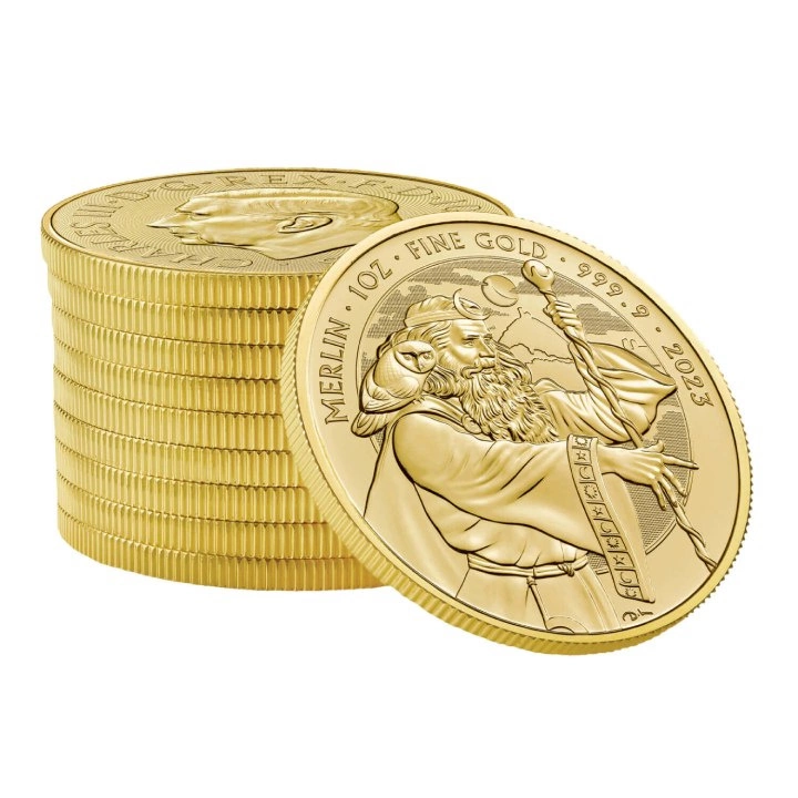 Az aranyérme hátoldalán egy varázsló képe látható, akinek vállán egy bagoly ül, kezében pedig egy pálcát tart. A hátoldalon szerepelnek a verés éve, a fém tisztasága, az érme súlya és a „MERLIN” felirat is. A hátoldalt David Lawrence tervezte.