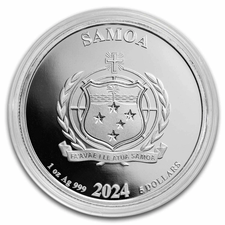 Előlap: Szamoa címere, a kibocsátó ország neve, a címlet, a kibocsátás éve, a súly és a fém finomsága.