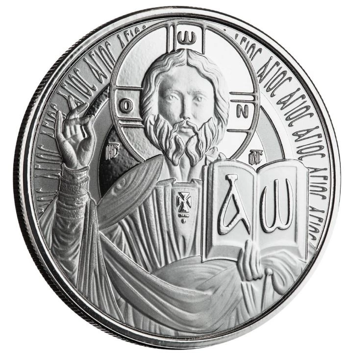 A hátoldalon Jézus Krisztus látható, aki egy „alfa” és „omega” szimbólumokkal ellátott könyvet tart a kezében.