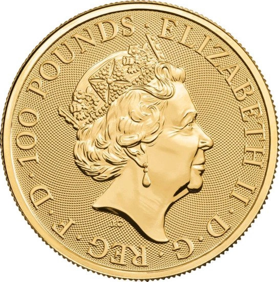 Awers monety przedstawia byka, nad którym widnieje informacja o wadze monety i próbie kruszcu, wynoszącej 9999 złota. Na rewersie monety widnieje wizerunek królowej brytyjskiej, Elżbiety II, nad którą wygrawerowany został tytuł królewski po łacinie, Dei Gratia Regina Fidei Defens, który w oryginalnie brzmi The grace of God, Queen, Defender of the Faith. Podany jest również nominał monety, który wynosi 100 funtów.
