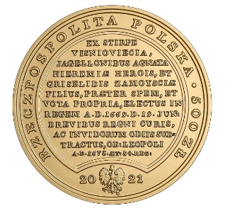 A Michał Korybut Wiśniowiecki aranyérme 2021-ben került kibocsátásra, 9999-es finomságú aranyból, 62,2 gramm tömeggel és 45 mm átmérővel. Ez a gyűjtői darab szigorúan limitált, mindössze 600 példányban készült. Ezenkívül az érme egy speciális kapszulába van zárva, és a teljes szett egy fadobozban, eredetiséget igazoló tanúsítvánnyal együtt kerül kiszállításra.