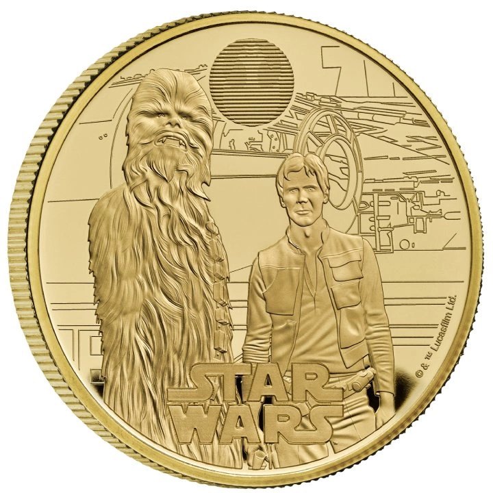 Az érme hátoldalán Han Solo és Chewbacca látható, a „STAR WARS” felirat és a Lucasfilm Ltd. szerzői jogaira vonatkozó információk.
