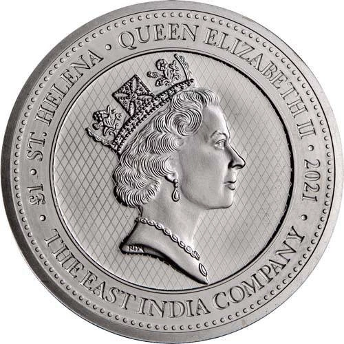 Az ezüstérme előlapján II. Erzsébet királynő képe látható, valamint a „St. Helena”, „Queen Elizabeth II” és „The East India Company” feliratok. Az előlapon szerepel az érme névértéke és a kibocsátás éve is. Az előlapot Raphael Maklouf tervezte.