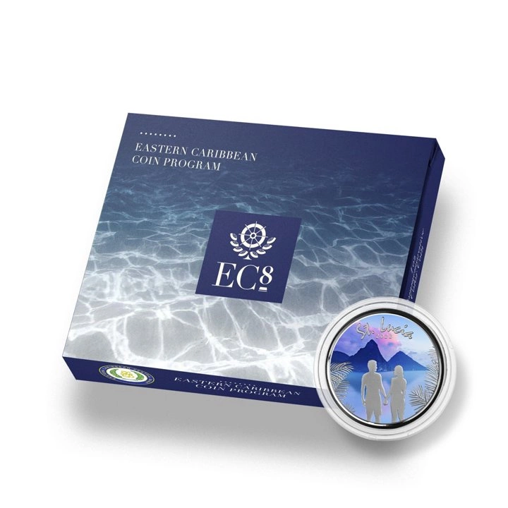 A hátoldalon egy férfi és egy nő látható színes természeti háttér előtt. A hátoldalon a „ST. LUCIA” felirat és a verés éve is szerepel.