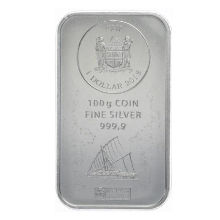 Rewers srebrnej sztabko monety przedstawia herb Republiki Fiji. Na rewersie znajduje się także informacjao wadze, próbie kruszcu, roku bicia i wartości nominalnej waloru.