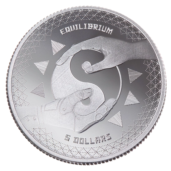 A hátoldalon az „EQUILIBRIUM” felirat és a Yin és Yang szimbólum látható emberi kezekben. A hátoldalon az érme névértékére vonatkozó információk is szerepelnek.