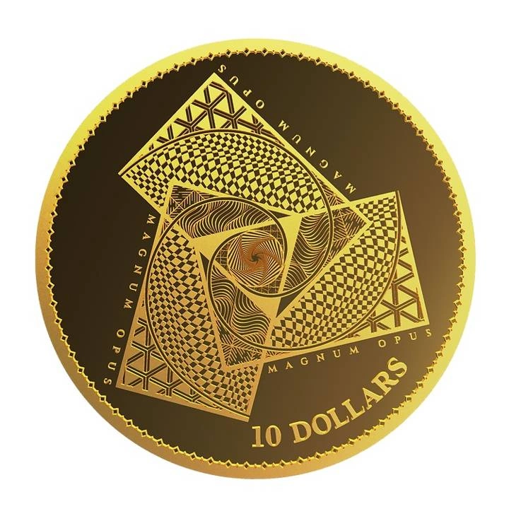 A hátlapon egymást átfedő geometriai alakzatok láthatók. A hátlapon szerepelnek még az érme névértékére vonatkozó információk és a „MAGNUM OPUS” felirat.